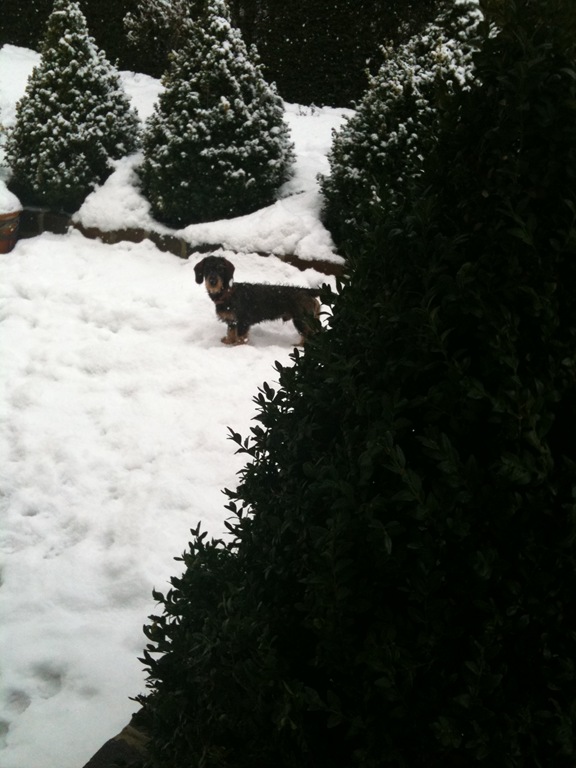 Unser kleiner Dackel wollte im Schnee nicht weiter und blieb auf der Terrasse.