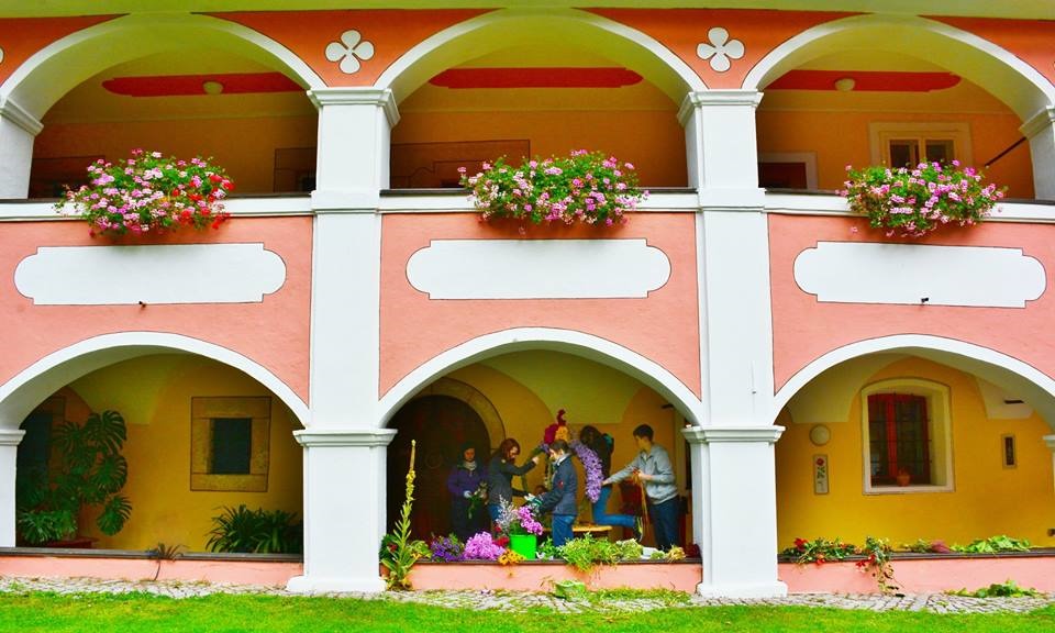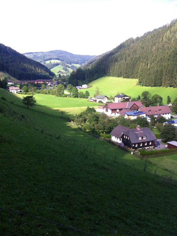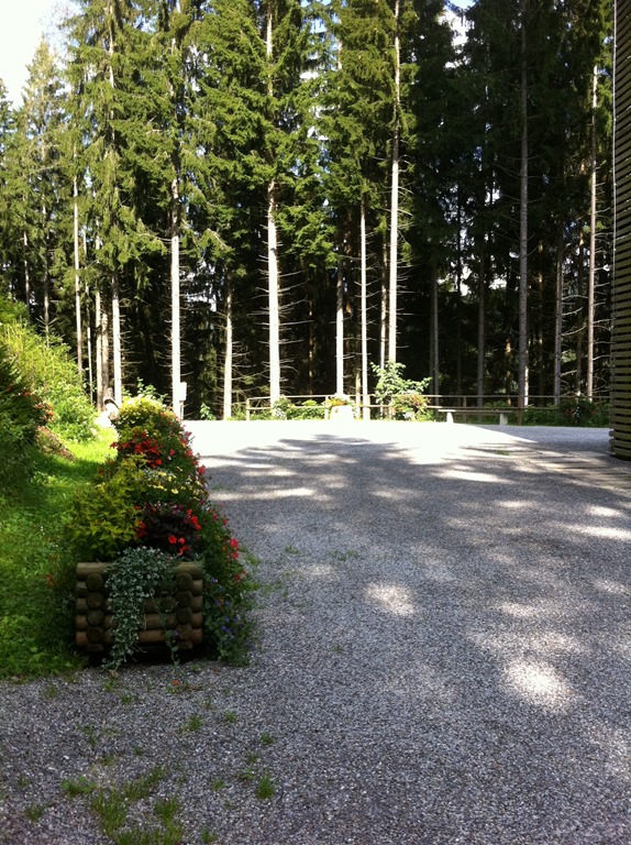 Ich dachte schon, dieses Mal müsste ich auf einen Besuch am Kreuz verzichten. Doch am letzten Tag machte mir meine Schwägerin die Freude, mich zum Kreuz zu begleiten. Wir wählten den Weg in die Klein-Veitsch zum Zwerglitzgraben. Von dort führte ein sanfterer Weg zurück durch den Wald zum Kreuz. Den Heimweg ging es den steileren Abstieg hinab zur Kirche in den wunderschönen Arkadenhof. Müde Wanderer bekommen dort immer etwas zum trinken oder auch mal eine Brotzeit. Doch wir mussten ja nur mehr hinter dem Feuerwehrhaus durch das Gartentor und schon waren wir in unserem Garten. Kaffee und ein Stück Kuchen schmeckte uns nach unserer ausgiebigen Wanderung doppelt so gut.