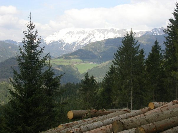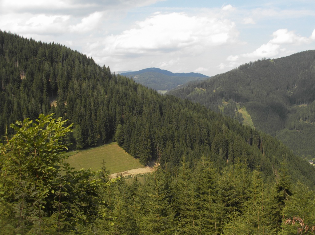Ich möchte Euch hier ein wenig von meiner Heimat zeigen. Das Tal zieht sich 15 Kilometer lang bis zum Bergmassiv der Hohen-Veitsch. Es ist wie ein liegender Baum, würde man es aus der Höhe betrachten. Der lange Stamm der sich in der Mitte gabelt in zwei Haupttäler die sich wiederum verästeln in mehrere kleine Seitentäler . 76 Quadratkilometer ist dieses Tal groß. Für Wanderer gibt es 55  Kilometer Höhenwege zu durchwandern und noch mehr. Für die Bauern auf den Bergkuppen sind die Wanderer willkommene Besucher.