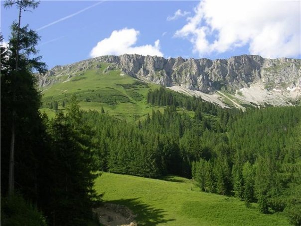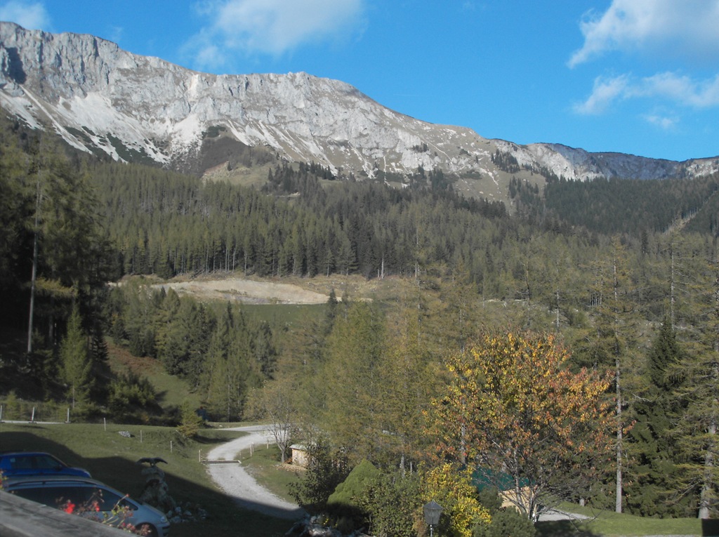 Das Bild wurde fotografiert, genau gegenüber vom Hochreiter. Jedoch nicht mit Blick ins Tal, sondern wir sehen ganz im Hintergrund die  Hohe-Veitsch. Dieses Bergmassiv schließt das Tal ab. Am mittleren Bergrücken führt der Pilgerweg zur Klein-Veitscher Almhütte. Eine wunderschöne Wanderung. Die Pilger wandern weiter nach Mürzsteg und Mariazell.  Doch kann man auch weiter auf die Hohe-Veitsch, wo es auch Uebernachtungsmöglichkeit gibt.