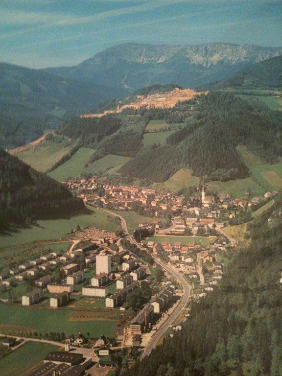 Veitsch aus der Vogelperspektive. Die Kirche in der Mitte direkt an den Berg gebaut, der den Ort in zwei Haupttrassen teilt. Der Berg gab vielen Menschen Arbeit, ein Heim und auch das tägliche Brot. Rechts ein Blick in das Kleinveitschtal und links zieht sich der Ortskern weiter in die Grossveitsch mit ihren Werkanlagen und weiter bis zum Fuße der Hohen-Veitsch.