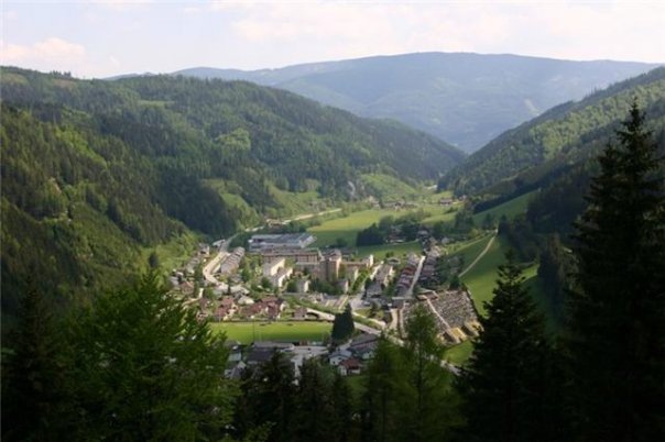 Links oben die Brunnalm, daneben Pretal, ein Seitental in der Grossveitsch, wo die ersten Arbeitersiedlungen aus Holz gebaut wurden. Am Hang oben, neben dem grauen Steinhaus direkt dahinter, war mein erstes zu Hause. Mein Schulweg war 4 Km weit bis ins Dorf. Dieses Tal hat eine Verbindung mit Turnau. Die Straße über den Bergsattel wurde schon früh ausgebaut. Das Bild darunter zeigt die Abzweigung dieses Tales vom Haupttal, wir erkennen an den Berg gelehnt rechts, die Fortsetzung der riesigen Fabrikhallen, der Arbeitsplatz von vielen Menschen. Im Bergbau und in den Hallen waren in meiner Kinderzeit, wohl an die 2000 Arbeiter im Dreischichtbetrieb beschäftigt. links daneben sehen wir wieder die Straße auf den Bruch, also zum Bergbau und den Anfang der Fabrikhallen mit dem riesigen Schornstein, der heute nicht mehr raucht.